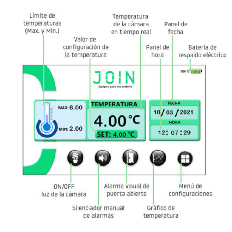 - Pantalla táctil de 7” para monitoreo de temperatura con resolución de 0.01°C